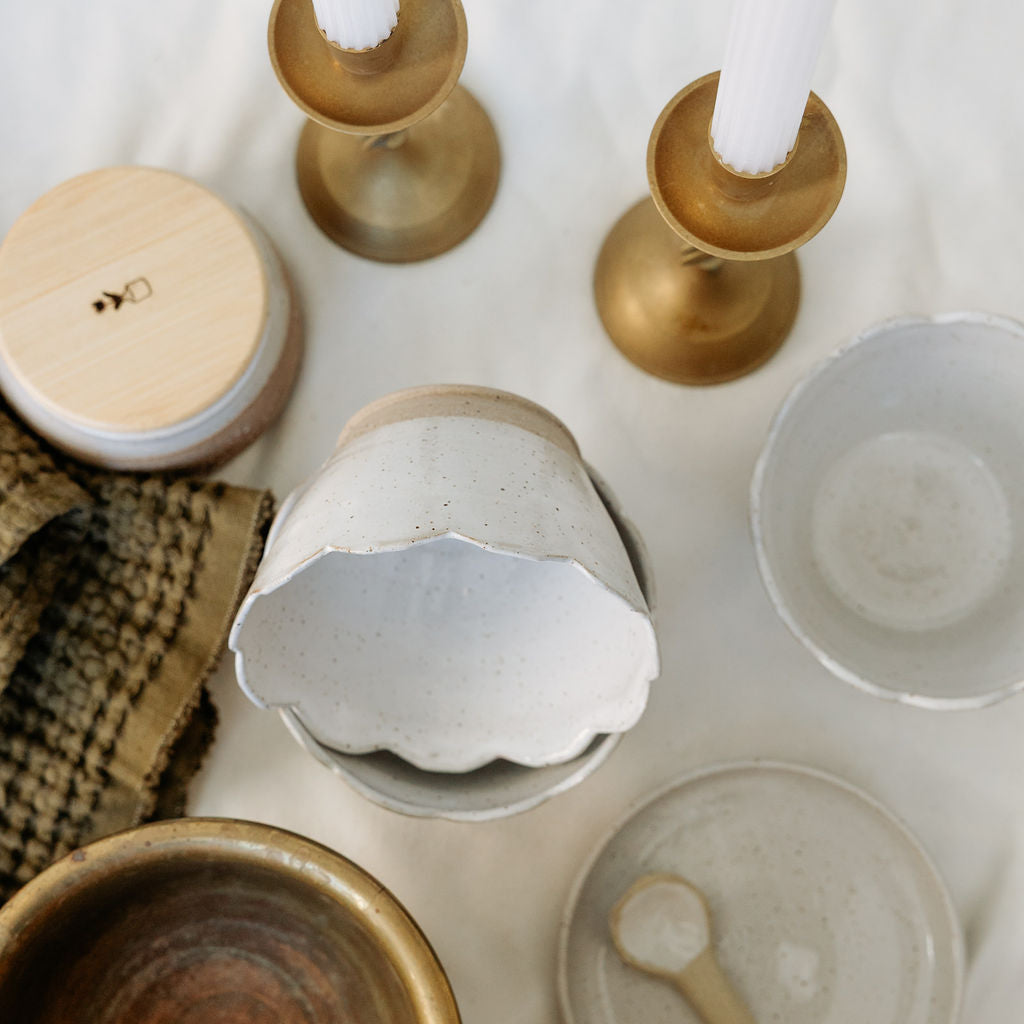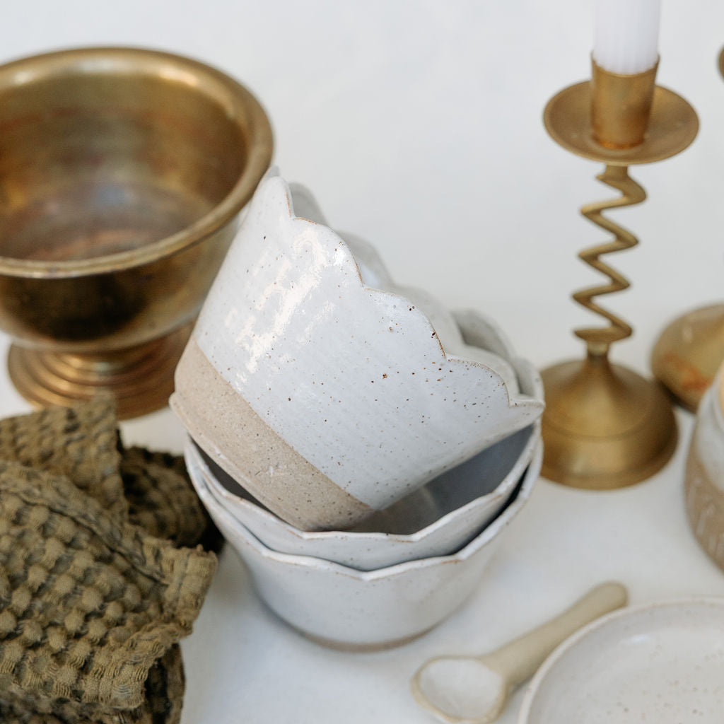 This handcrafted ceramic bowl is made for everyday use, with quiet, thoughtful detail. Thrown by hand and finished in a soft white glaze, it features a gently scalloped rim that adds movement and a subtle sense of rhythm to the form.